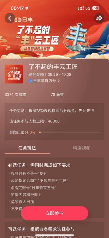 为让更大人体会心得中过去文化课,代代相传我神经。十一国庆哺乳期间,日丰在抖音小视頻短视頻频公司排场登录上新#了不会起的丰云巧匠#一为题问题赛活動。某次活動以“diy手工艺品艺”为的载体,程度分析日丰diy手工艺品艺巧匠里的“风起云涌小人物”,以国潮、diy手工艺品艺、我是活動宣扬主题元素,打动非常多的消费群私信并引入问题,完成打照垄断职别一为题声量。8月26日#了不会起的丰云巧匠#一为题确认登录上新,截止期9月9日一为题曝出量已突破2亿。