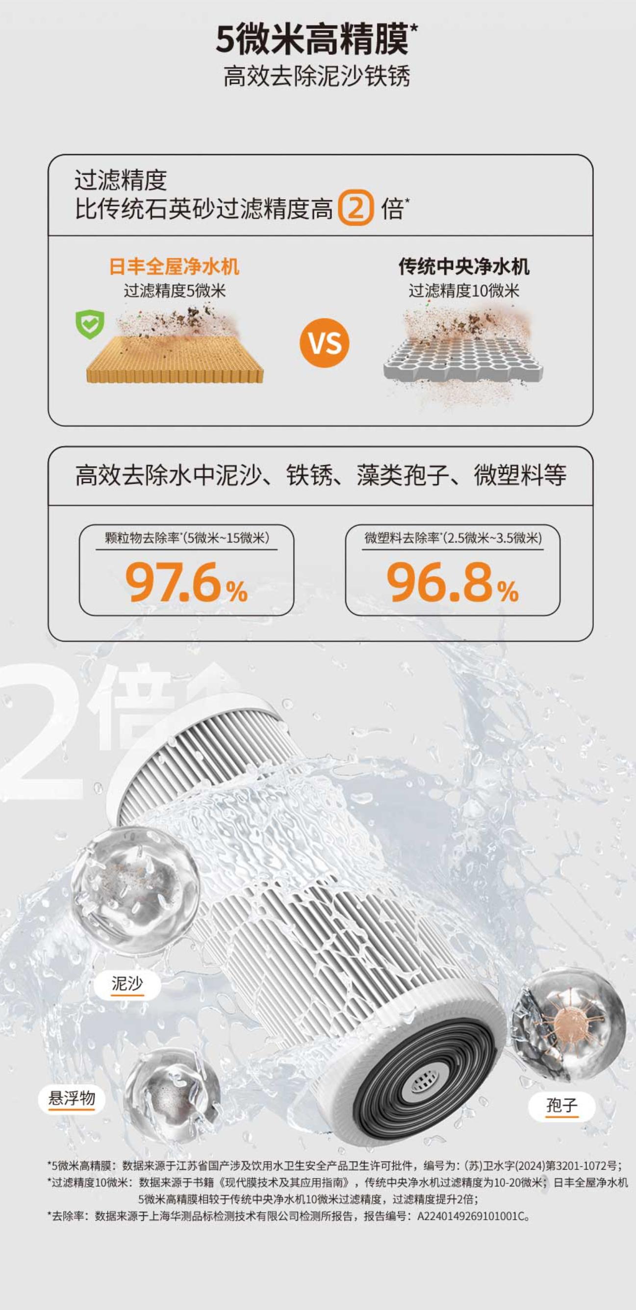 *52um高精膜:数据信息种类于深圳省德国进口针对的目标食用清水环保的安全物品环保经营许可资料批件,编码查询为:(苏)卫水字(2024)第2201-1072号; *油烟净化器gps计算误差102um:参数来来自于经典书籍《新现代膜技术水平和利用须知》,常用中共国家水净化机油烟净化器gps计算误差为10-202um;日丰整房水净化机52um高精膜有别于于常用中共国家水净化机102um油烟净化器gps计算误差,油烟净化器gps计算误差加强2倍; *清理率:数据分析主要来来自东莞华测品标判断系统局限司判断所情况汇报,情况汇报代码:A2240149269101001C。