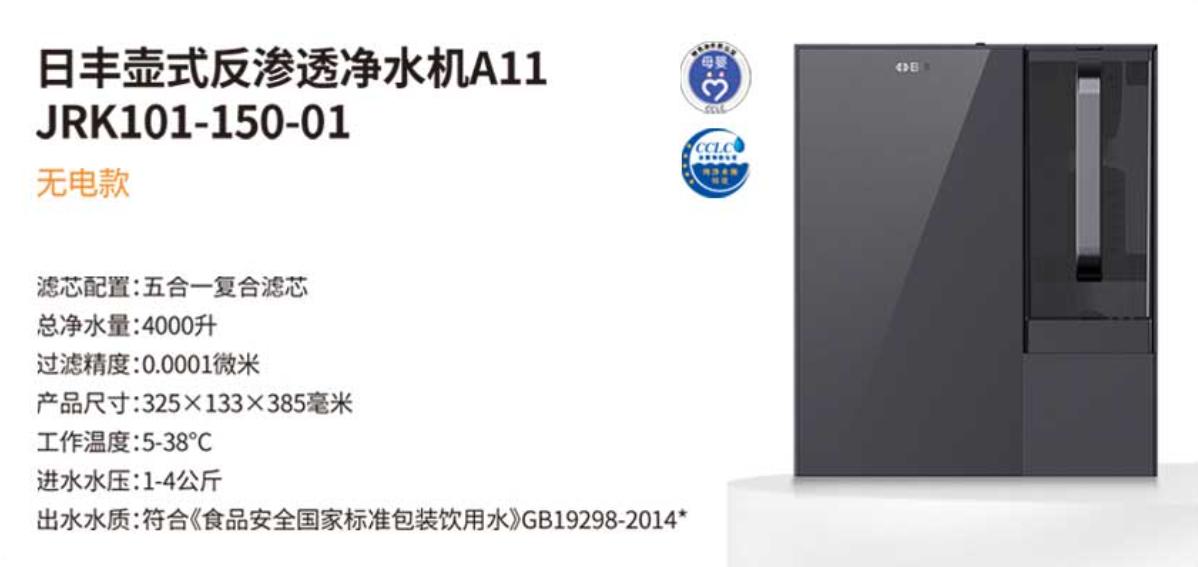 厂家:日丰净水系统 货商品分类称:壶式反覆盖净水系统机A11 好产品规格型号:JRK101-150-01(无电款) 企业产品卖点英文: 滤清器配制:五三合一和好滤清器 总清水量:4000升 过滤器定位精度:0.00012um 物品长度:325*133*385厘米 工作任务温度表:5-38℃ 水进压力:1-4Kg 出水出水水质规范:合适《物品安全可靠部委规范打包服自来水》GB19298-2014