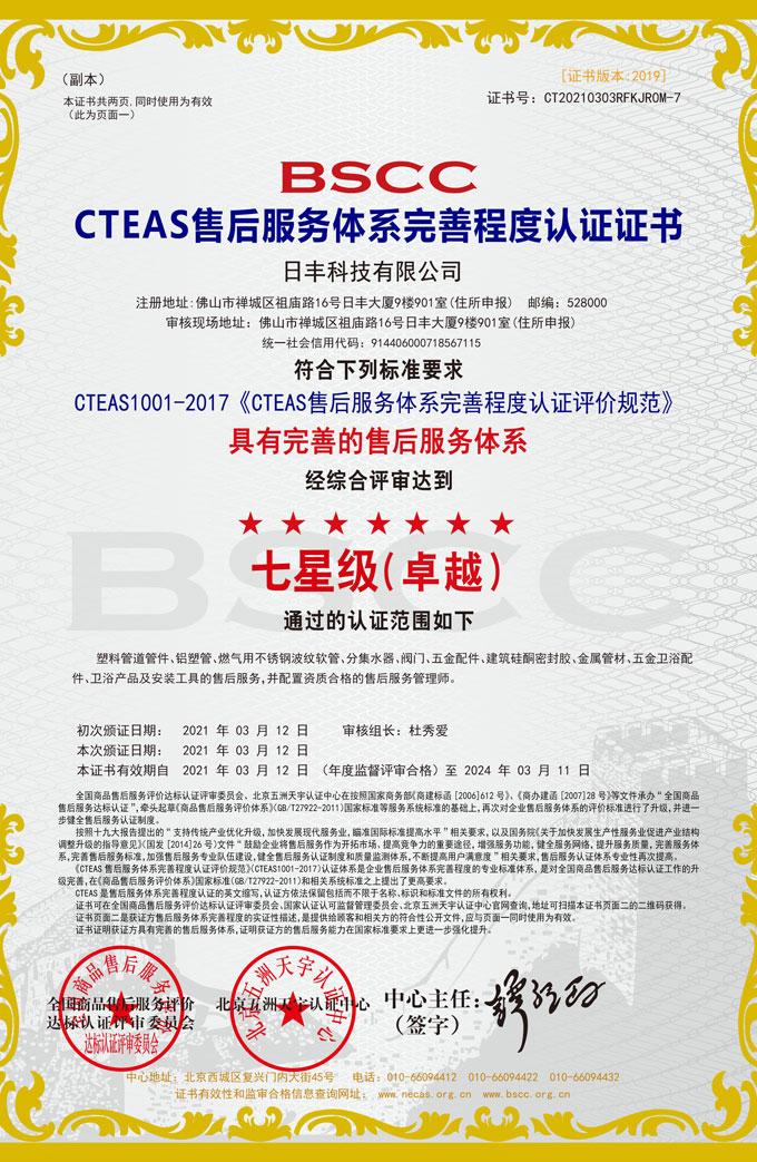 20这么多年来,在严守好产品品質的还,日丰还总是洞查股票市场和朋友的需求,营造引领者提供售后服务的售后服务行业的提供售后服务的策略。其实在2010年,日丰就在我国新一轮为朋友作为全免 的通水试压及输送管论文检测、检收等的全套售后服务行业化提供售后服务的,启动中国现代管材提供售后服务的售后服务行业售后服务行业化、规则化提供售后服务的之开创。 近些近些年,日丰又在多余售后设备管理的前提上,制做形式 化合并和持续,重大消息还推出了“设备的+售后设备管理”的企业新形式 ——日丰卫生稳定安全小卫士售后设备管理,为消费者能提供免弗检测工具正伪、免弗闭水试压、免弗查看管道阀门、免弗拍好导出等售后设备管理。而且,日丰卫生稳定安全小卫士售后设备管理倡导者的 “双保修期限”(设备的产品质量管理保修期限与锡焊产品质量管理保修期限),在在业内网络推广角度大、施行力强、铺盖面广、受益国内 億萬消费者,为力促企业售后设备管理大体进展制做了领航的影响。